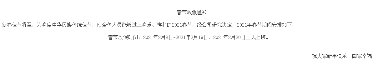 春节放假通知新春佳节将至,为欢度中华民族传统佳节,使全体人员能够过上欢乐、祥和的2021春节,经公司研究决定,2021...