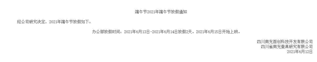 端午节2021年端午节放假通知 经公司研究决定,2021年端午节放假如下: 办公部放假时间:2021年6月13...